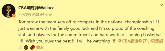 遼籃訓(xùn)練師瓦萊士,也在深夜通過(guò)個(gè)人社交媒體給參加全運(yùn)會(huì)的隊(duì)友們加油鼓勁。他說(shuō),希望兄弟們能如愿把冠軍帶回家!盡管這確實(shí)很難,但是美好的愿望是一定要有的,說(shuō)不定就實(shí)現(xiàn)了呢?